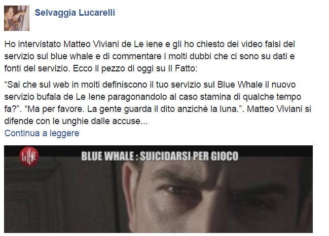 “Ho intervistato Matteo Viviani de Le iene e gli ho chiesto dei video falsi del servizio sul blue whale e di commentare i molti dubbi che ci sono su dati e fonti del servizio”, dice la Lucarelli.