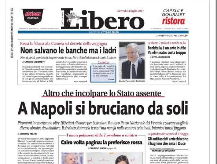 Oggi il quotidiano Libero ha titolato così in prima pagina: “A Napoli si bruciano da soli”. Nel catenaccio del pezzo si legge: “Piromani inceneriscono 100 ettari di bosco per boicottare il nuovo Parco Nazionale del Vesuvio e salvare migliaia di case abusive da abbattere. Il sindaco si straccia le vesti ma non fa nulla per i criminali. Intanto i turisti fuggono”. Ciliegina sulla torta, l’occhiello: “Altro che incolpare lo Stato assente”.
