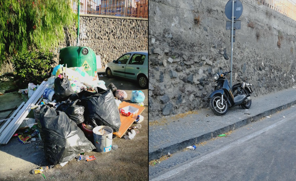 “Ci sono da una settimana bottiglie di vetro messe per terra – ci racconta un lettore, G. F. – perché la gente non vuole mettere ad una ad una le bottiglie nelle campane e poi da stamattina anche scarti edilizi! Lo scooter stava prima davanti una scuola poi l’hanno messo vicino l’indifferenziata e gli spazzini l’hanno messo poi sul marciapiede. Inoltre se una persona anziana vuole depositare i rifiuti non arriva perché sono alti! Ed inoltre sono stati tagliati sopra con rischio anche di farsi male!”