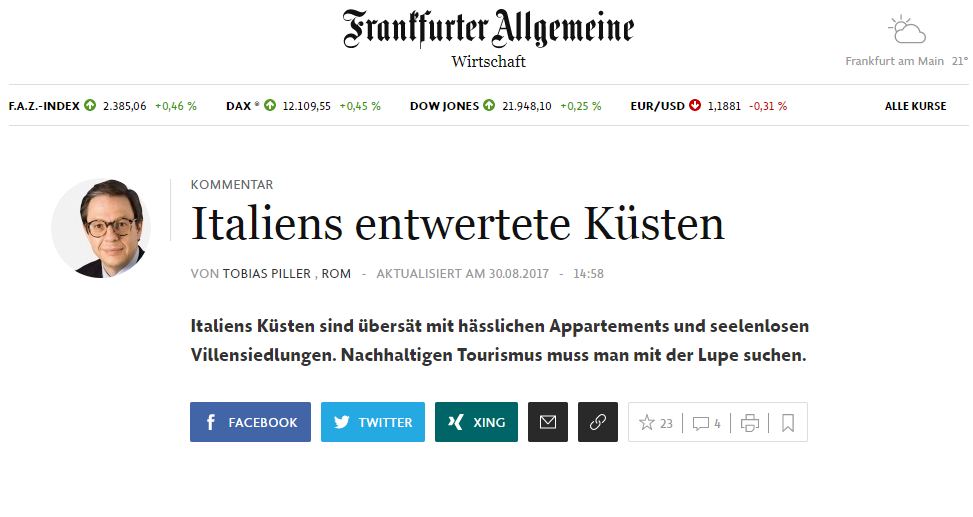 “Il Mezzogiorno possiede quasi tre quarti dei 9000 km di costa italiana ma mancano hotel attraenti sulle coste del Sud Italia, benché proprio adesso si sta cercando nuove mete turistiche per sostituire la Turchia o l’Egitto. Ma costruire nuovi alberghi è vietato su gran parte delle coste dell’Italia del Sud. Questa è una reazione di facciata ai peccati del passato, quando imprenditori edili locali, spesso legati alla politica con alleanze poco trasparenti, hanno coperto le coste con costruzioni senza gusto”.