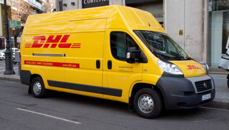 VALENCIA, SPAIN - JANUARY 28, 2014: A DHL delivery van on the street in the city center of Valencia. DHL is a world wide courier company that operates in 220 countries with over 285,000 employees.