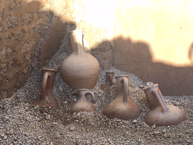 Le anfore rinvenute intatte, dovevano contenere olio, vino e salse di pesce: un’anfora presenta iscrizioni dipinte in cui si leggono numeri, a indicare i quantitativi, e, verosimilmente, il prodotto contenuto. L’uso come deposito dell’ambiente è confermato dai graffiti visibili su una delle pareti dell’ambiente, che ribadiscono l’attività di stoccaggio.