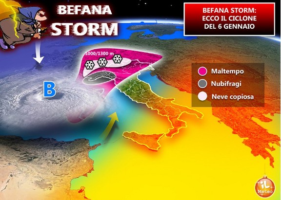 Mentre la Befana porterà dolcetti e carbone ai bambini di tutta Italia, il tempo sarà spaccato in due sabato 6 gennaio. Le prime previsioni del portale di meteorologia prevedono la Befana Storm con “tempo in peggioramento su Piemonte, Liguria, Alpi e Prealpi tutte. Precipitazioni intense al Nordovest, anche con locali nubifragi, specie sulla Liguria. Neve copiosa sui settori alpini. Peggioramenti in serata in Sardegna e alta Toscana”.