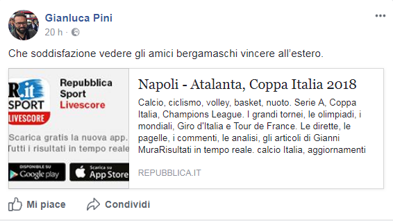 Il leghista ha condiviso il link di Repubblica per seguire i risultati live della partita ed ha aggiunto un suo personale commento: “Che soddisfazione vedere gli amici bergamaschi vincere all’estero.”. La frase si commenta da sola. Eppure, sembra assurdo che un parlamentare della Repubblica Italiana possa definire Napoli “estero” su un social network, che, ricordiamo, stando alla Corte di Cassazione viene considerato al pari di un luogo pubblico.