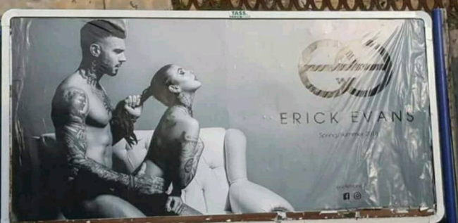 Fa discutere il cartellone pubblicitario di Erick Evans comparso nei quartieri flegrei di Bagnoli e Fuorigrotta. Il marchio di capi d’abbigliamento, infatti, ha decisamente fatto parlare di sé. Il manifesto ritrae un uomo, completamente nudo, che prende da dietro una donna, anche lei priva di vestiti, tirandola per i capelli.