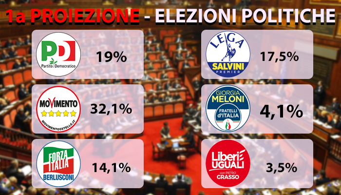 SWG ha diffuso la prima proiezione alla Camera su una copertura del 15%. Non cambia la tendenza registrata al Senato. Il Movimento 5 Stelle resta sempre il primo partito, al 32,1%, seguito dal PD al 19%. La Lega Nord (17,5%) resta ancora davanti a Forza Italia (14,1%).