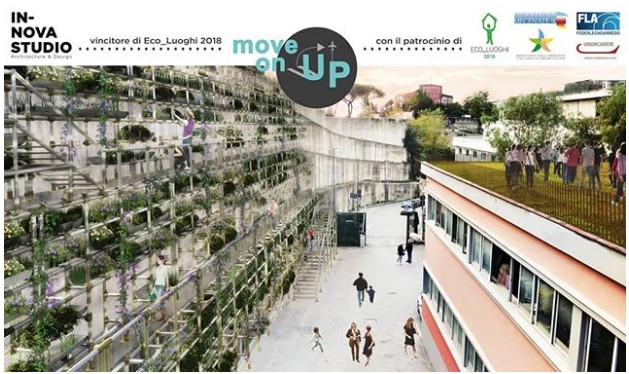 “Move on up”, il nome della proposta progettuale, ha puntato sull’area di Capodichino, dove si registra un elevato consumo del suolo ed dove è alto l’impatto di agenti inquinanti legati alle infrastrutture di trasporto. Il progetto vincitore prevede la riqualificazione degli elementi verticali (recinti e terrapieni infrastrutturali, muri e terrapieni degli spazi pubblici nei quartieri limitrofi all’Aeroporto di Napoli) attraverso la trasformazione in dispositivi verticali con funzione socio-ecologica.