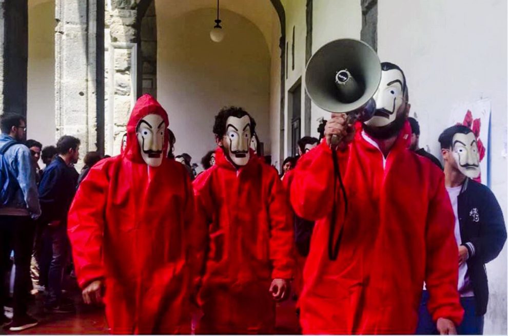 Napoli – Prendendo spunto dal noto serial cult di Netflix “La Casa di Carta”, gli studenti oggi hanno protestato a Napoli, contro il “caro tasse”, indossando tute arancioni e la maschera di Salvador Dalì. Il flash mob è andato in scena nel cortile del dipartimento di Lettere dell’Università Federico II, dove sono state sparpagliate banconote finte.