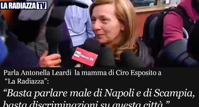 Antonella Leardi la mamma di Ciro, il tifoso napoletano ferito sabato sera, ha parlato nel corso del programma in onda su Radio Marte, La Radiazza. La donna con voce rotta dal pianto trova anche il coraggio e la forza di difendere Napoli e Scampia: