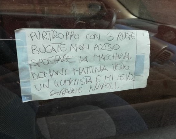 A raccontare la vicenda è Riccardo, il capofamiglia, che spiega di aver parcheggiato la sua auto il sabato mattina in via Speranzella e di aver poi trovato la sera quando ero pronti a fa rientro a casa, tre gomme dell’auto squarciate. La macchina era parcheggiata in prossimità di un bar e Riccardo aveva occupato il luogo in cui il locale era solito posizionare i tavolini. Conferma arrivata subito dopo da una donna presente sul luogo e che si è qualificata come cugina del gestore del bar, che ha inveito verbalmente contro la malcapitata famiglia. Ovviamente il tutto si sarebbe risolto se chi ha commesso questo atto di vandalismo, si fosse rivolto ai vigili urbani, che avrebbero fatto una multa e rimosso l’auto. Ipotesi che Riccardo ha evidenziato nel conversare con la donna, che di rimando e con una certa arroganza ha risposta: “qui la legge non serve”.