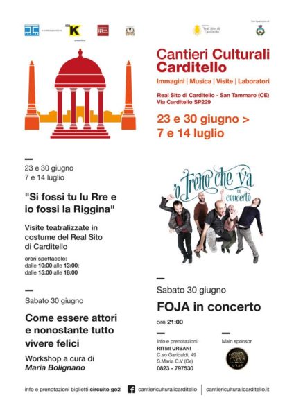 Tra le tante iniziative ci sono le aperture straordinarie e gratuite nei weekend e gli eventi teatralizzati in costume. L’evento Cantieri Culturali Carditello è stato organizzato per il 23 e 30 giugno e poi per il 7 e 14 luglio con degli spettacoli tra cui il concerto dei Foja.
