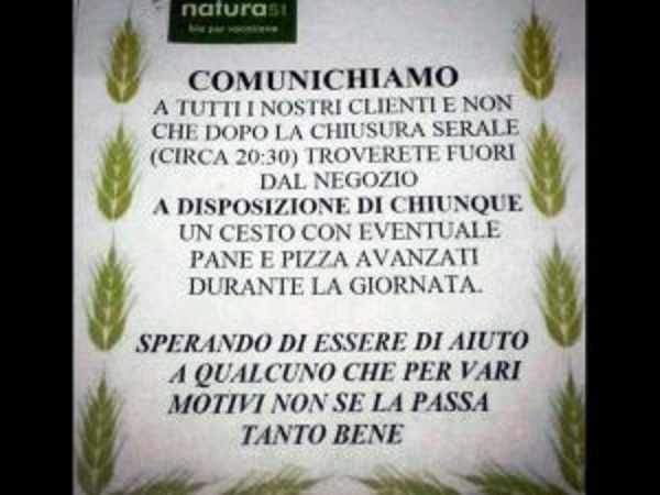 Con questo cartello si comunica che ogni sera, dopo l’orario di chiusura, verrà lasciato fuori dall’esercizio un cesto con pane e pizza avanzati durante la giornata. Le leccornie potranno essere presi da chiunque abbia bisogno. Ovviamente si spera che ad usufruire dell’iniziativa sarà solo chi ha realmente bisogno e non chi ha solo voglia di uno spuntino gratis.