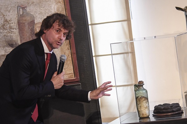 Straordinario è osservare come la bottiglia di vetro contenente l’olio d’oliva sia identica a quella raffigurata nell’affresco dai Praedia di Giulia Felice che Alberto Angela stava riprendendo nei depositi del Museo, “una specie di grotta delle meraviglie”, li definisce. Il popolare divulgatore ha raccontato la sua esperienza mostrando sia l’opera che la bottiglia.