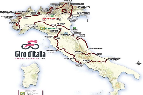 Dopo la partenza israeliana dell’anno scorso, si tornerà a partire dall’Italia e più precisamente da Bologna che ospiterà una spettacolare cronometro di 8,2 chilometri, gli ultimi due dei quali in salita, verso il Santuario della Madonna di San Luca.