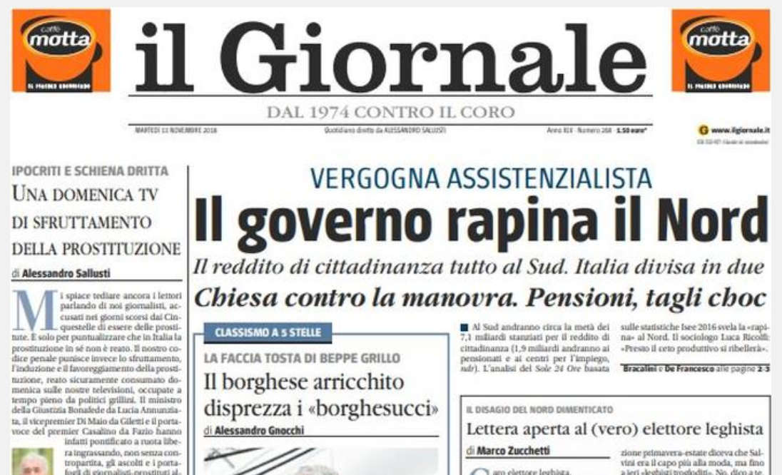 “Vergogna assistenzialista. Il governo rapina il Nord: il reddito di cittadinanza tutto al Sud. Italia divisa in due“, titola Il Giornale. “Al Sud andranno circa la metà dei 7,1 miliardi stanziati per il reddito di cittadinanza – si legge ancora nell’articolo – (1,9 miliardi andranno ai pensionati e ai centri per l’impiego). L’analisi del Sole 24 ore basata sulle statistiche Isee del 2016 svela la ‘rapina’ al Nord“.
