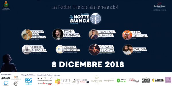 Caserta -Dopo undici anni torna la Notte Bianca a Caserta. Sabato 8 dicembre dalle 19:00 alle 03:00 vari spettacoli si terranno presso le principali piazze della città: Piazza Vanvitelli, Piazza Duomo, Piazza Margherita, Piazza Correra, Corso Triste, Piazza Marconi e Piazza Ruggero.