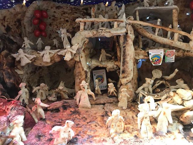 Lo sfondo del presepe è fatto con pizze da mezzo metro, così come il pavimento, le strutture, compresa la capanna della natività, con pezzi più piccoli e cornicioni. La cosa più sorprendente, però, sono i pastori: tutti riprodotti con l’impasto della pizza e tutti incredibilmente realistici. Il presepe napoletano ha dei canoni, dei personaggio che devono esserci necessariamente, escludendo ovviamente la sacra famiglia. Tutte queste figure ci sono anche nel particolare lavoro culinario.
