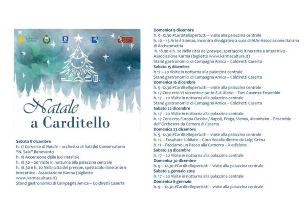 Nella stessa serata, inoltre, alle ore 18, il pubblico potrà assistere all’accensione delle luci che renderanno magica l’esperienza delle visite al Real Sito di Carditello. Sarà anche possibile, a seguire, visitare in notturna la palazzina centrale, accompagnati nelle stanze private e in quelle di rappresentanza del re dagli operatori dell’Associazione Agenda 21. Infine, negli spazi delle scuderie sarà ospitato lo spettacolo itinerante e interattivo Nella città del presepe, a cura dell’Associazione Karma, con due repliche alle 18.30 e alle 20, che sarà ripetuto, negli stessi orari, il giorno 9 dicembre.