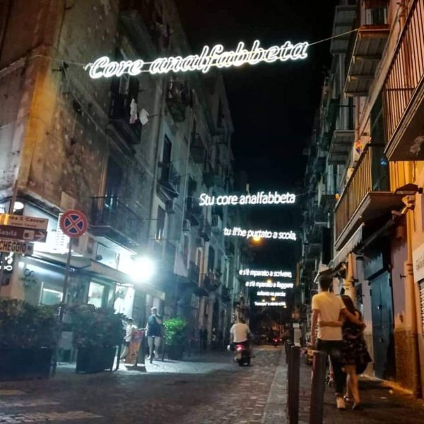 E per tutto il periodo natalizio tutto il Rione splenderà con luminarie che riprendono i versi della bellissima poesia di Totò “Core Analfabeta”.
