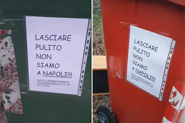 Anche in questo caso, l’equazione “Napoli” uguale “monnezza” è pienamente rispettata. Ma non solo, perché chi ha attaccato il manifesto sui cassonetti ha voluto rimarcare, ancora una volta, la “differenza” tra il Nord rispettoso del vivere civile ed il Sud sporco e incivile. Fino a quando continuerà questo razzismo del tutto gratuito nei confronti dei meridionali? Come devono sentirsi quei meridionali costretti a vivere in una parte dell’Italia che continua ancora ad emarginarli?