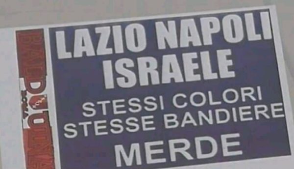 Un manifesto vergognoso e oltraggioso ha tappezzato alcuni quartieri di Roma da questa mattina. La scritta non solo ha un sottofondo razzista e di odio territoriale, ma è arricchito da una evidente venatura antisemitica: “Lazio, Napoli e Israele, stessi colori, stesse bandiere. Merde”. Autori di questa vergogna sarebbero stati alcuni tifosi di Roma Balduina, riconosciuti grazie alla firma riportata al lato di ogni manifesto con tanto di acronimo tipicamente romano – SPQR – al centro della firma.