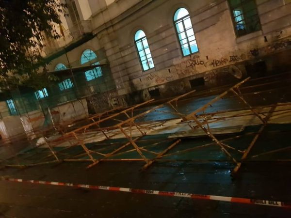 Nella giornata di ieri, parte di una impalcatura montata due mesi fa a titolo cautelativo all’esterno della scuola Dante Alighieri lato piazza Carlo III è crollata. L’evento non è stato causato dal maltempo o dal vento, come tiene a sottolineare Giampiero Perrella, presidente della IV Municipalità, ma dal gesto criminali di alcuni delinquenti.