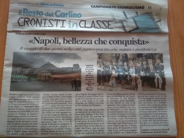 “Oggi vi voglio raccontare il mio viaggio a Napoli. Tanti credono che Napoli sia una città pericolosa per la criminalità, ma non è così. E’ una città tutta da vivere, ricca di colori, e i napoletani sono persone di cuore, sempre pronte ad aiutare chi sia in difficoltà. Percorre le stradine di Napoli è sempre una scoperta e un’emozione: voglio raccontare la mia esperienza in modo che anche voi possiate un giorno dedicere di viverla. […] In via dei Tribunali ho assaggiato la pizza a portafoglio e la pizza fritta, ripiena di ricotta, ciccioli campani e provola, che si mangia solo a Napoli. […] In via Chiaia alla sera ho visto uno spettacolo di colori tra le colonne della Basilica di San Francesco da Paola. […]Ho fatto colazione con una sfogliatella riccia e ho bevuto un caffè nocciolato. Al Belvedere di San Martino ho ammirato questa meravigliosa città dall’alto in tutto il suo splendore. Il mio sguardo era completamente rapito da questa visione d’insieme: il Vesuvio, la Costiera Amalfitana, la collina di Posillipo e Capri. […] Napoli ha tanto da offrire ai visitatori e io ne ho potuto vedere solo una piccola parte, che però mi è entrata nel cuore, perciò sono convinto che ci tornerò”.