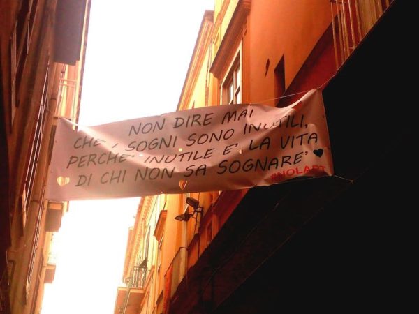“Volevamo un’idea semplice da realizzare, ma che allo stesso tempo fosse d’impatto. Un’idea che suscitasse un’emozione. L’obiettivo è quello di creare degli striscioni che rievocano versi di poesie napoletane, oppure strofe tratte da canzoni della nostra terra, famose in tutto il mondo” – ci spiega Luca, che aggiunge – “Attraverso questo progetto si vuole sensibilizzare l’opinione pubblica creando un nuovo tipo di esperienza visiva e sensoriale, che porti ad interagire positivamente con i cittadini e con il territorio circostante, creando un “movimento” alternativo, basato sui valori essenziali della vita come l’amore, la famiglia, l’arte e la musica”.