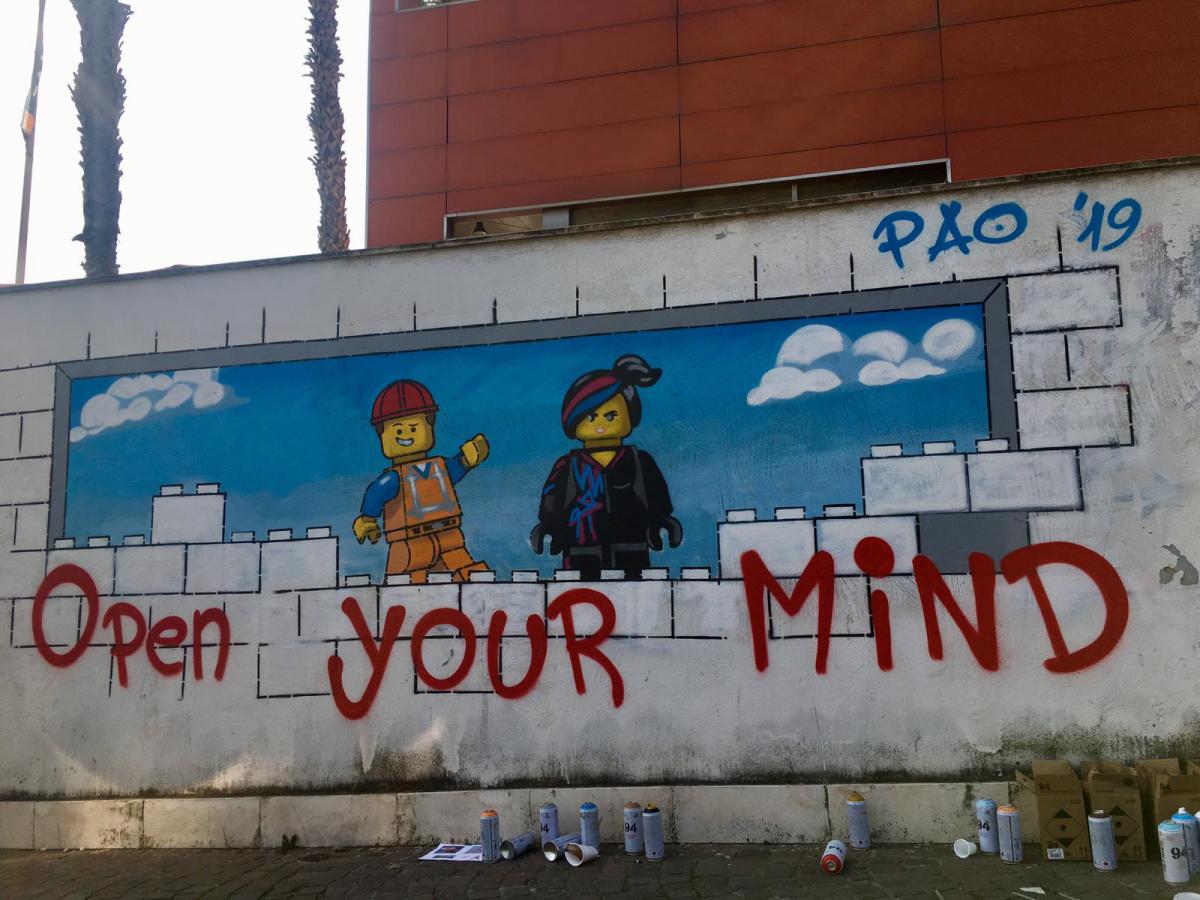 Infatti è proprio questo il messaggio che l’artista Pao ha voluto trasmettere con la sua opera: un muro, immancabilmente composto da mattoncini LEGO bianchi, viene sfondato mostrando il cielo azzurro che nascondeva. Sull’intero disegno campeggia l’enorme scritta rossa “Open Your Mind”, che tradotto significa “Apri la tua mente”.