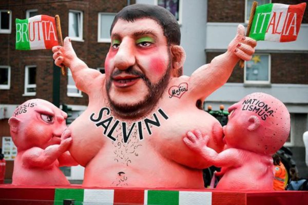 Il Carnevale di Dusseldorf prende di mira il Ministro dell’Interno e leader della Lega Matteo Salvini. Si tratta della sfilata carnevalesca più politica d’Europa, e che fa della satira il suo marchio distintivo. A poche settimane dalle elezioni europee, non poteva mancare lo sfottò anche per Salvini, ritratto con due seni mentre allatta due gemelli dai nomi emblematici: Razzismo e Nazionalismo. Inoltre, la maschera del leghista alza in alto due bandiere tricolore con su scritto “Brutta Italia”. Non manca, infine, anche un altro dettaglio. Sulla spalla sinistra, Salvini ha tatuato un cuore con il termine “Mafia” al suo interno”.