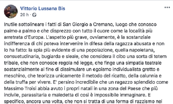 Lo stupro della 24enne porticese nella stazione della Circumvesuviana di San Giorgio a Cremano ha avuto, ovviamente, un risalto mediatico nazionale. Purtroppo c’è chi, anche per un avvenimento del genere, non perde occasione per sentenziare offese completamente gratuite contro il popolo napoletano. E’ il caso di Vittorio Lussana, giornalista e direttore della testata online Laici.it, che ha scritto sul suo profilo Facebook questo post: