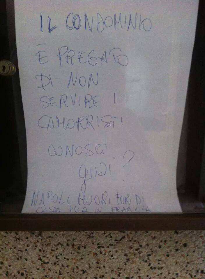 Insomma sembra essere un vero attacco frontale nei confronti dei napoletani, considerati dal volantino esposto all’interno del condominio come se fossero tutti camorristi. Il volantino esordiva, come è possibile leggere dall’immagine: “Il condominio è pregato di non servire i camorristi (…) Napoli muori fori di casa mia in Francia “.