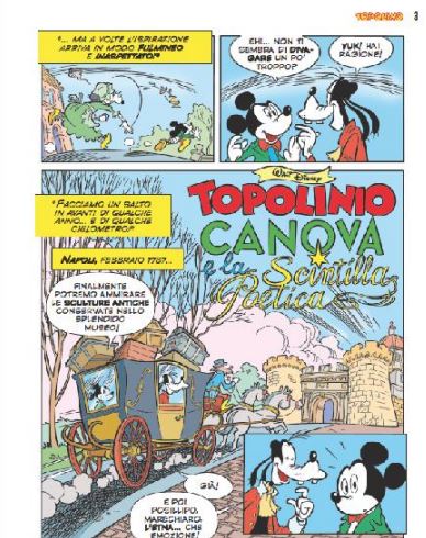 L’avventura, scritta e disegnata in maniera magistrale dall’autore napoletano Blasco Pisapia, è un omaggio al grande artista neoclassico e si inserisce nel filone educational che unisce l’umorismo delle storie di Paperi e Topi a eventi culturali di grande rilievo. “Topolinio Canova e la scintilla” poetica sarà pubblicata su Topolino n. 3310, in