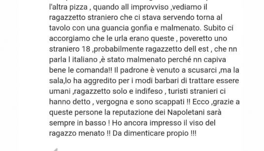 Napoli – Un giovane cameriere originario dell’Europa dell’Est sarebbe stato preso a schiaffi da altri membri del personale o dallo stesso titolare di una pizzeria di via Tribunali a Napoli. Il fatto è emerso in seguito ad una recensione su Tripadvisor che ha reso noto l’accaduto. Questo il commento incriminante: