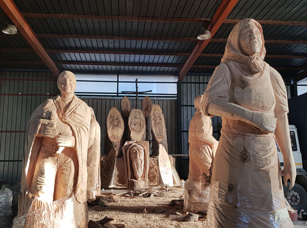 Il volto di Cristo sarà scolpito nel ceppo di faggio con tecnica Carving, che darà inizio al percorso cristiano. Seguiranno le sculture rappresentanti: il falegname mentre usa la lama dentata, il fabbro con l’incudine e il martello, una contadina con la falce e il grano e il buon pastore. Con altri ceppi di faggio, abete, cipresso e pioppo sono stati realizzati dipinti monocromatici e un polittico raffigurante Maria SS. degli Angeli, un dittico che riproduce l’annunciazione, un dipinto che rappresenta il ritrovamento dell’affresco dell’effige della Vergine e gli angeli che avvolgono il carro. Il fondale è realizzato con una Croce ricavata da rami di Ulivo.