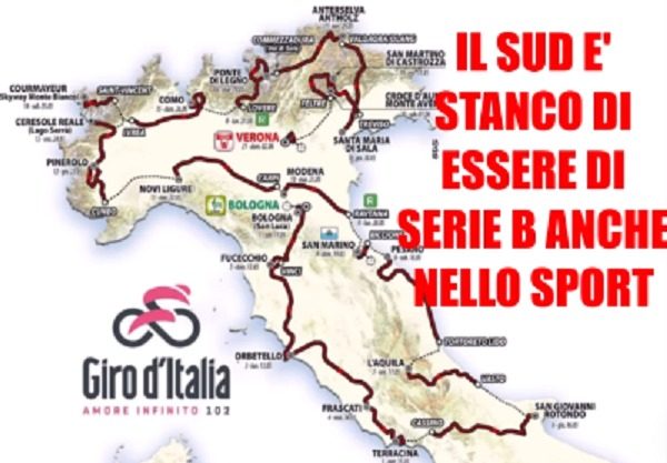 Il Movimento Neoborbonico, a tal proposito, ha lanciato una proposta provocatoria: “Visto che il Giro d’Italia anche quest’anno ha di fatto cancellato il Sud con l’eccezione di una fugace apparizione pugliese e abruzzese, il Movimento Neoborbonico ha rivolto un appello alle società ciclistiche affinché si organizzi un Giro delle Due Sicilie e si inizi a chiamare “Giro d’Italia del Centro Nord” quello attuale partito da qualche giorno“.