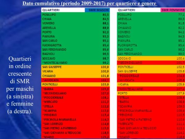 A Napoli si muore di più nei quartieri popolari che in quelli benestanti. Col colore verde che vede in cima il quartiere di Posillipo con 80,5 per i maschi e 77,1 per le femmine; poi con l’arancione di Vicaria con 100,9 per i maschi e 105,9 per le femmine; e infine con il rosso capeggiato da Miano con 125,2 per i maschi e 118,6 per le femmine.