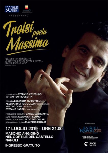 Un appuntamento da non perdere per tutti gli innamorati di Massimo Troisi stasera, mercoledì 17 luglio, alle ore 21, nel cortile del Maschio Angioino. L’ingresso è gratuito fino ad esaurimento dei posti a disposizione.