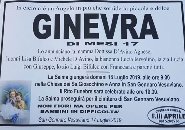 Come detto sopra, sul manifesto accanto al nome di Ginevra non c’è nient’altro. I familiari, altresì, sull’invito chiedono opere di bene a favore dei bambini, niente fiori. La scelta di non sottoscrivere il cognome sembra giusta, adeguata alla situazione che in questo momento vivono i familiari della vittima e soprattutto la madre Agnese D’Avino. La comunità, ora, chiede che Salvatore paghi per l’atto disumano compiuto.