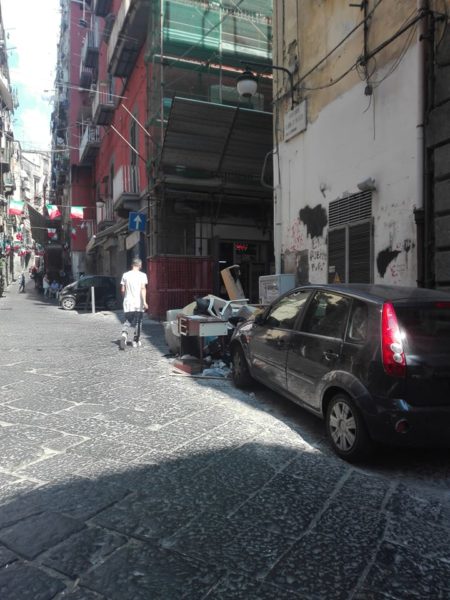 Cumuli di immondizia invadono i vicoli di Napoli, qui ci troviamo in via Cedronio, nella zona che fa ad angolo con vico Storto Sant’Anna di Palazzo.