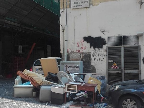 Dopo aver denunciato la mancata raccolta differenziata in alcune zone dei Quartieri Spagnoli, in questo vicolo c’è chi addirittura ha pensato bene di “smaltire” un’intera camera con materasso, tavolo, divano e sedie. Mesi fa vi raccontammo dello stesso problema in una zona molto trafficata della città come quella di via Chiaia, dove una famiglia rovistava tra i rifiuti accumulatisi sul marciapiede.