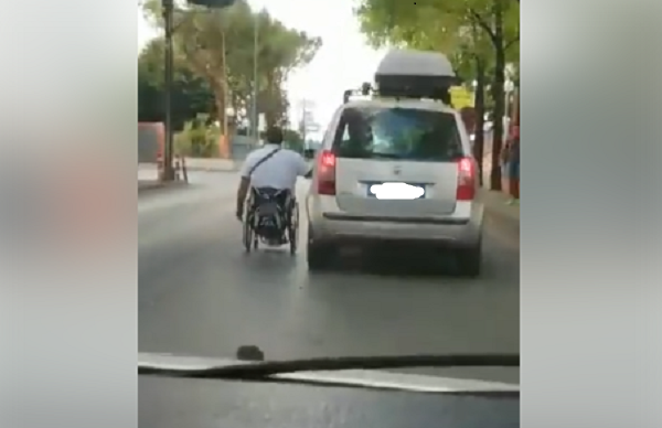 Un disabile in carrozzina si fa trainare da un’automobile a centro strada. E’ successo a Volla, nel Napoletano.