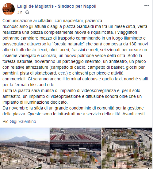 Napoli– Questa mattina il Sindaco Luigi de Magistris ha lasciato un post sui suoi canali social per la questione di Piazza Garibaldi. A cavallo delle Universiadi, in piazza sarebbe dovuta sorgere una strada alberata e non solo. Era prevista una riqualifica dell’area che non è ancora avvenuta.