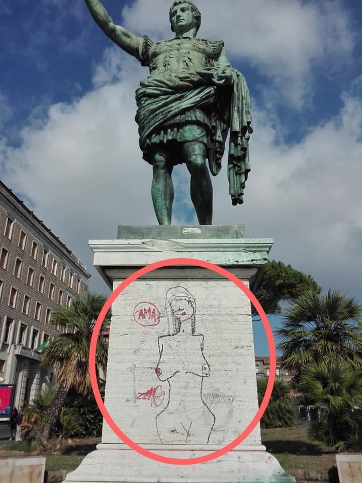 Ancora un monumento napoletano napoletano vandalizzato, dopo la fontana di Monteoliveto. Un disegno osceno, l’immagine di una donna nuda è spuntata sotto la statua di Ottaviano Augusto, che si trova sulla terrazza di via Cesario Console.
