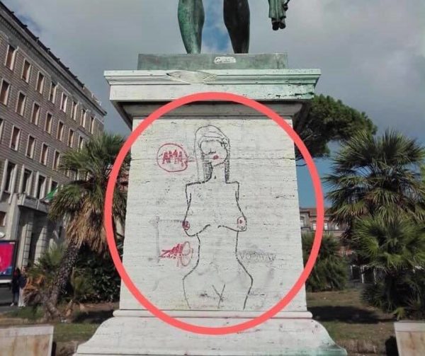 Pene più severe per chi sfregia monumenti di tale importanza, come la statua in questione, a Napoli, forse questa è l’unica soluzione. Di seguito, la foto completa del monumento vandalizzato: