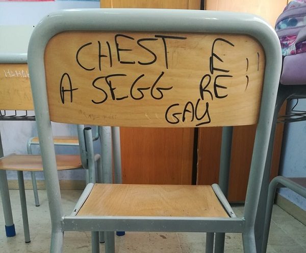 Lo dimostra il racconto pubblicato da Marco Maria Taglialatela, architetto e professore di tecnologia napoletano, sul suo profilo Facebook. Per anni il docente si è seduto su una sedia goliardicamente imbrattata dagli alunni con la scritta “Chest è a segg r”e gay”, “questa è la sedia dei gay”. Come se non bastasse, pur volendo passare sullo scherzo di cattivo gusto dei ragazzi, si è aggiunto che nessun altro docente ha mai voluto sedersi su quella sedia, forse per paura di essere definito omosessuale con quel solo gesto.