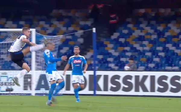 IL PRIMO RIGORE – Al 22esimo minuto del secondo tempo, Pasalic entra in maniera scomposta su Callejon. Il centrocampista, in netto ritardo, alza la gamba in modo pericoloso dando una tacchettava in testa allo spagnolo. Per quell’intervento il nerazzurro prende un cartellino giallo e immediatamente chiama i soccorsi azzurri, consapevole del suo gesto. Secondo Giacomelli il fallo è di poco fuori l’area di rigore e quindi solo punizione per gli azzurri. Un episodio dubbio sicuramente da rivedere al Var. Sulla punizione dal limite, Milik prende la traversa. Questa intera azione non risulta negli highlights di Sky.