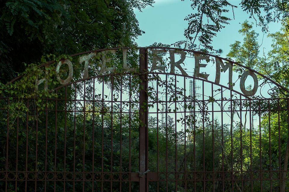 All’esterno dell’Hotel Eremo troviamo ancora il cancello di metallo con la scritta recante il nome dell’albergo. Oggi è chiuso, ma in passato consentiva di percorrere il viale, attualmente impraticabile, che porta all’ingresso principale sito al piano terra. Bisogna dunque intraprendere la strada sulla destra, che porta sul retro e consente di accedere al primo piano. Da lì è possibile sia scendere al piano terra che salire al secondo piano, ma le scale non sono sicure: manca il corrimano e, per ciò che si può osservare, potrebbero anche crollare da un momento all’altro.