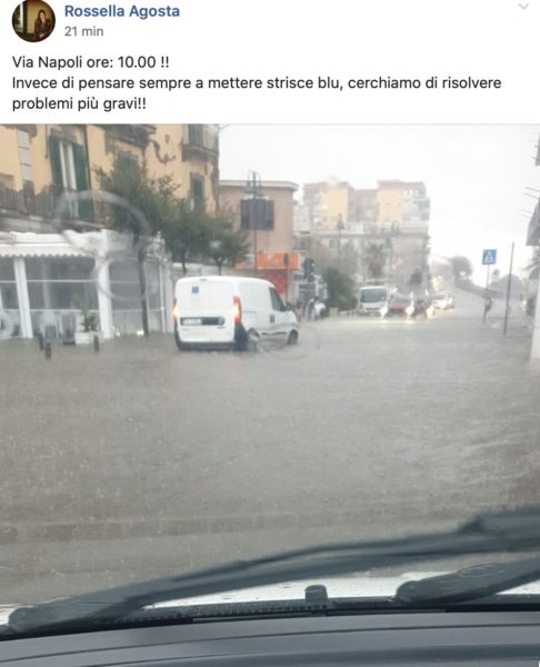 Strade allagate a Via Napoli e tombini saltati per le forti piogge di questa notta. I residenti della zona lanciano l’allarme e postano sui social le foto.