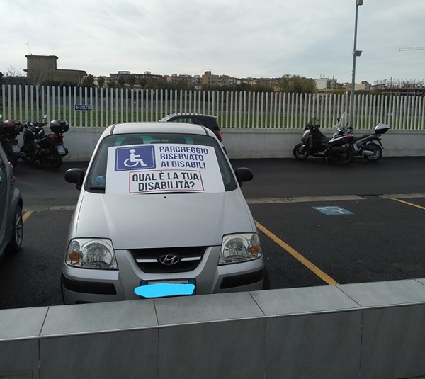 “Parcheggio riservato ai disabili, qual è la tua disabilità?”. È il contenuto del messaggio dei cartelli, esposti sui parabrezza delle automobili non autorizzate che sostano sugli stalli riservati ai disabili, preparati dalla palestra Rhyfel Village in via Montale a Mugnano di Napoli.